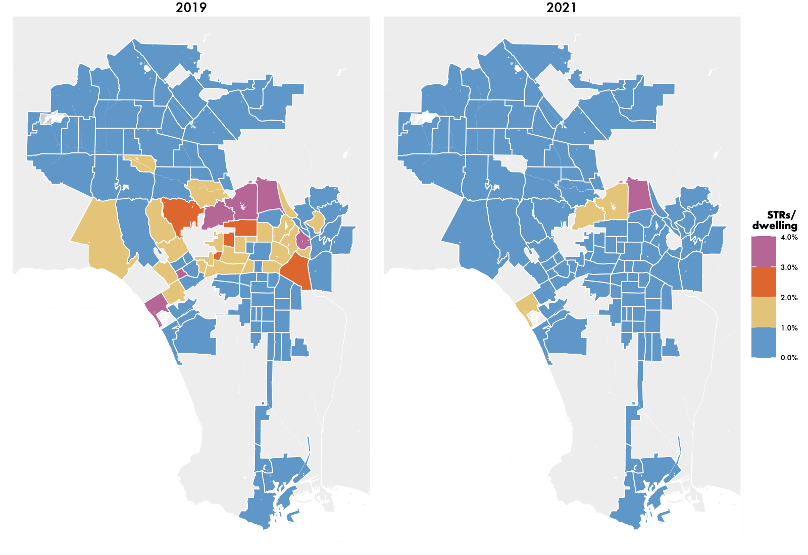Figure 2: Active STRs as a share of all dwelling units in Los Angeles by neighborhood in 2019 (L) and 2021 (R)