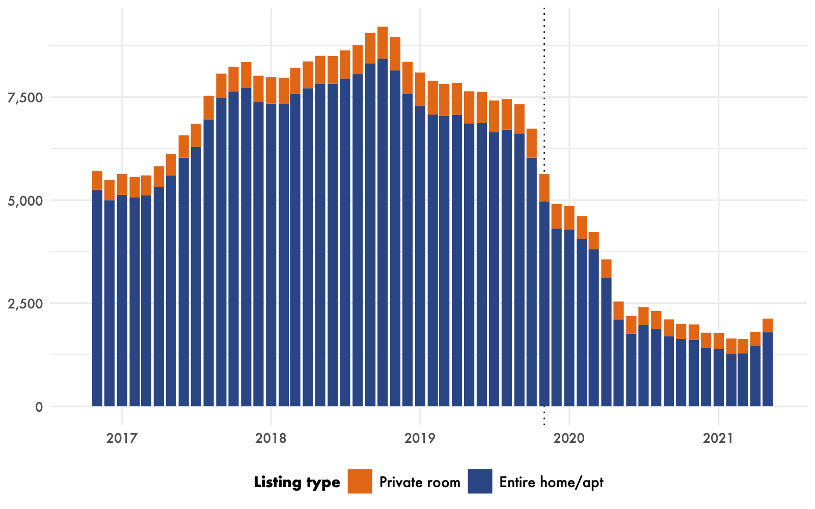 Since the start of the pandemic, however, Los Angeles’ STR market has performed almost exactly in line with its peer cities. The balance of evidence strongly suggests that Airbnb’s mass removal of listings in late 2019 produced a one-time decline in STR activity in the months prior to the pandemic, but that there has been no discernible impact of Los Angeles’ regulatory enforcement in the year and a half since. The decline in STR activity in Los Angeles over the last year and a half can be almost entirely attributed to the COVID-19 pandemic. This implies, conversely, that, when the pandemic-induced collapse in travel demand comes to an end, STR activity in Los Angeles will quickly return to its former level.